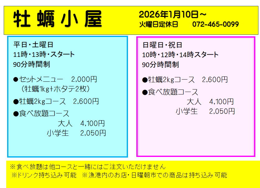 お待たせしましたー!!! 2026年1月10日より牡蠣小屋開始します 例年に比べると遅い始まりとなり ご迷惑をおかけしました お値段設定も変更になっておりますのでご確認ください ご予約お伺いしております